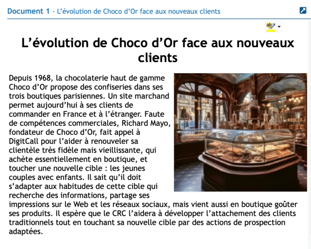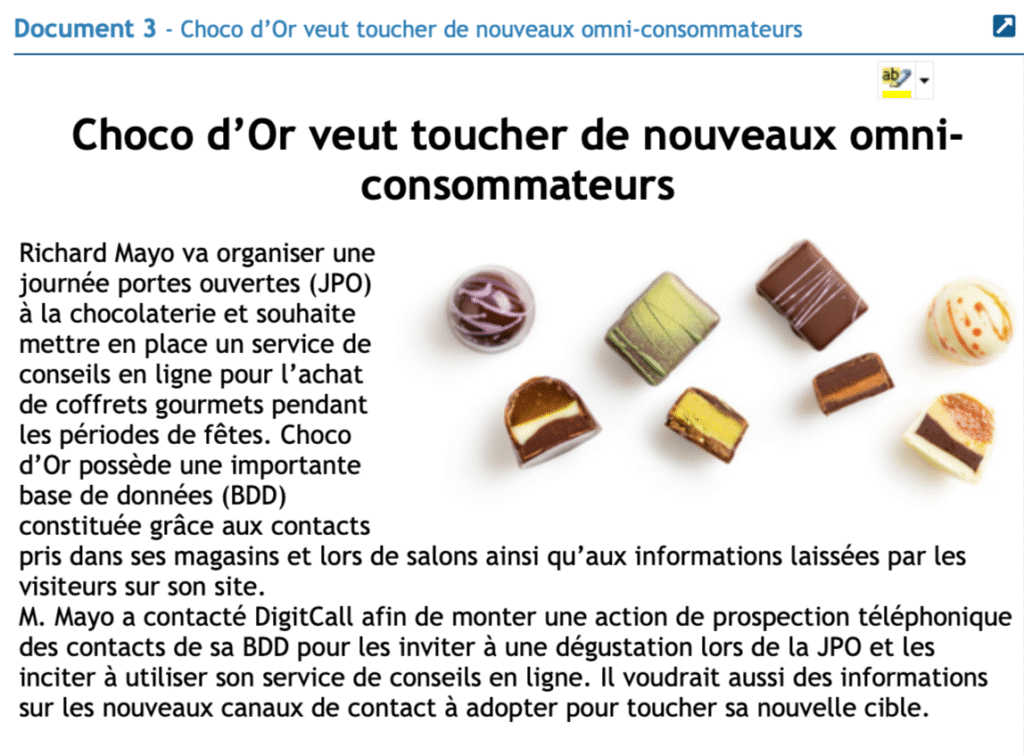 Mateo Lejeune, responsable du secteur « Chocolat » chez DigitCall, a participé à votre recrutement. Il vous charge de travailler sur les besoins d’un nouveau client, la chocolaterie Choco d’Or, de façon à lui fournir une prestation qui corresponde à ses attentes.