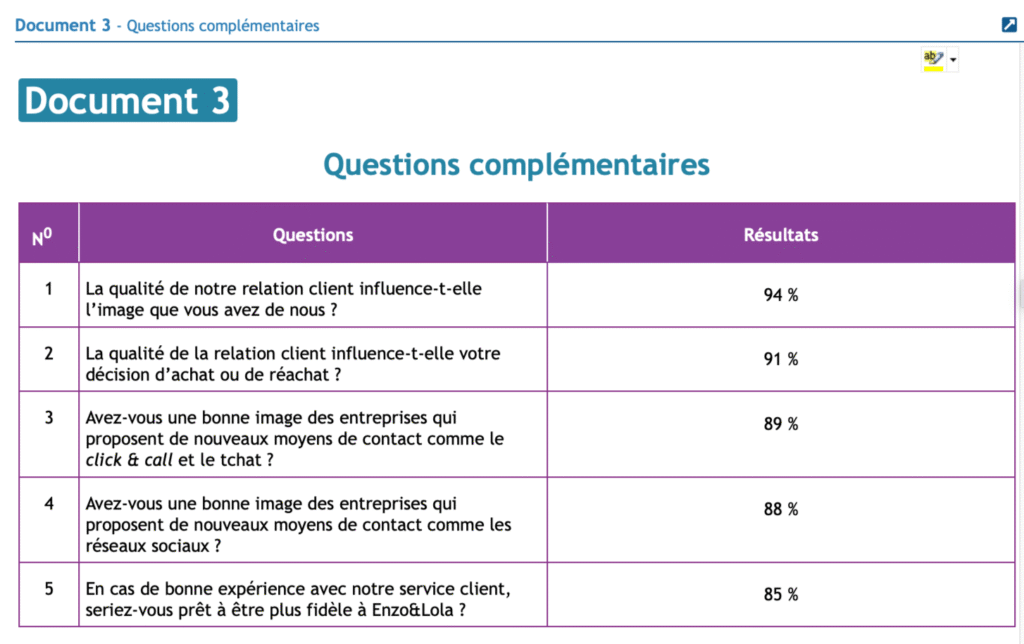 3. Justifiez l’intérêt de poser les questions complémentaires (document 3), puis analysez les résultats à ces questions complémentaires et proposez des solutions pour améliorer la satisfaction client.